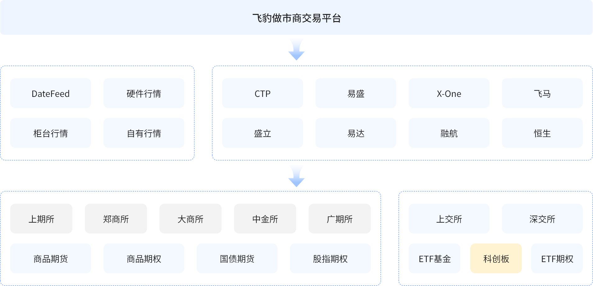 在業務范圍上,飛豹平臺覆蓋包含中金所的國債期貨及股指期權,上期所、廣期所、鄭商所、大商所的商品期貨、商品期權,同時支持上交所、深交所、北交所的股票、ETF基金、ETF期權及公募Reits等業務品種,為用戶提供全面的交易支持。